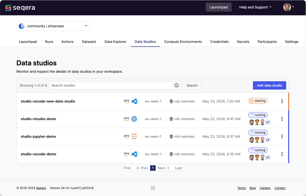 Select the Data Studios tab in Platform to view all data studio sessions. The list includes the name, cloud provider, analysis template, region, author, creation date, and status of each session. In this view, you can add a new data studio and start, stop, or connect to an existing session. Dynamically filter the list of data studios using the search bar to search by name (default), author username, or compute environment name. Select the data studio to open a detailed view that displays configuration information.